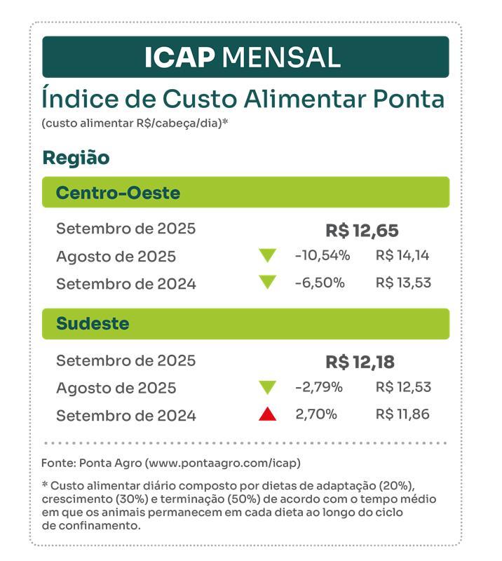 O mês de setembro de 2025 trouxe um alívio significativo para o confinador brasileiro. O Índice de Custo Alimentar Ponta (ICAP) apresentou retração nas duas principais regiões produtoras, sinalizando um momento mais favorável para a margem de lucro.