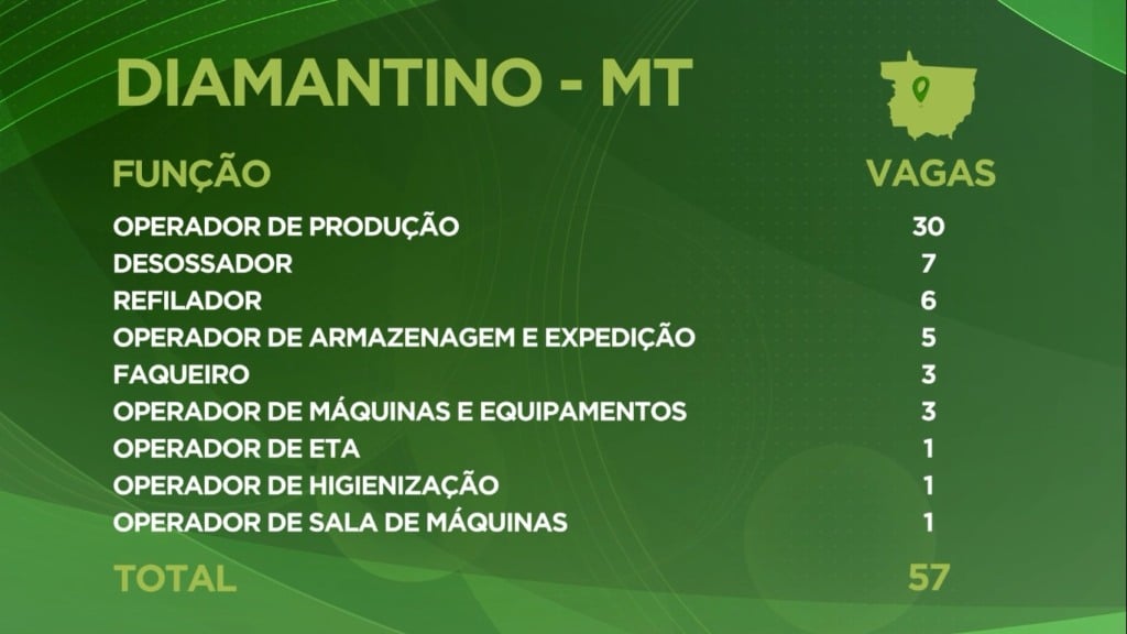 Ainda de acordo com a analista, mais da metade das vagas são para Operador de Produção, ideais para quem busca o primeiro emprego. A empresa também oferece oportunidades para Desossador, Refilador, Operadores de Armazenamento, Expedição e Faqueiro.