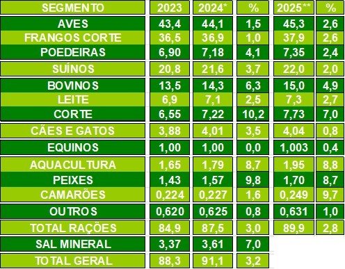 A entidade projeta 90 milhões de toneladas ao final do ano, avanço de 2,8%. O resultado considera apenas rações, já que os dados de sal mineral ainda não foram consolidados. O setor é composto pela soma dos dois segmentos.