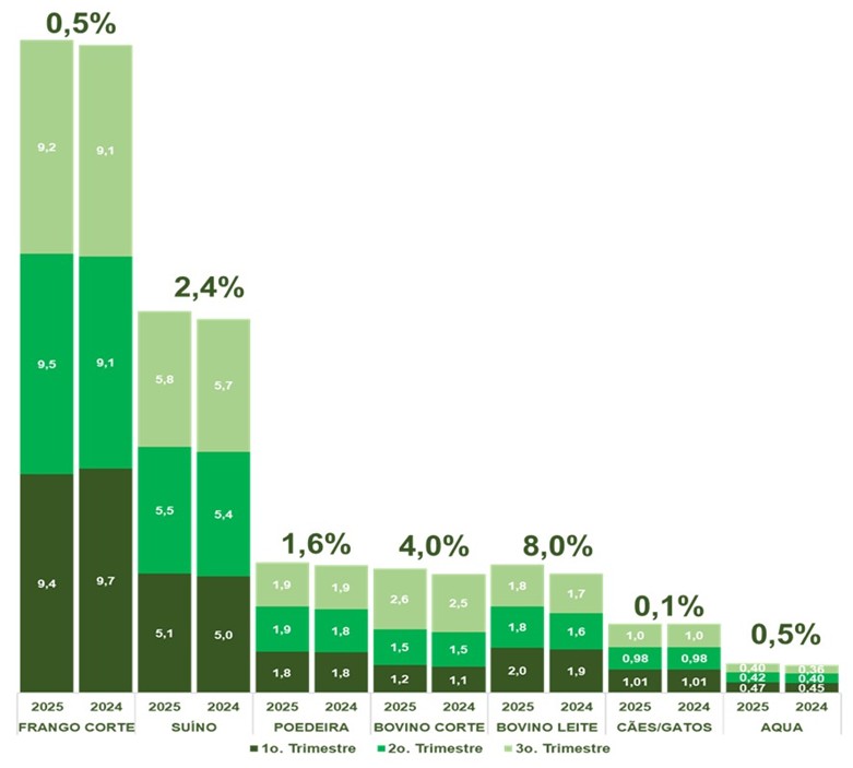 O segmento de alimentação para pets consumiu cerca de 3 milhões de toneladas entre janeiro e setembro. A estimativa para o ano é de 4 milhões de toneladas: 80% para cães, 19% para gatos e 1% para demais espécies. “A nutrição de precisão e os sistemas intensivos consolidam a previsibilidade técnica, reforçam a eficiência econômica e asseguram ao Brasil uma posição estratégica entre os maiores players globais de proteína animal”, conclui Zani.